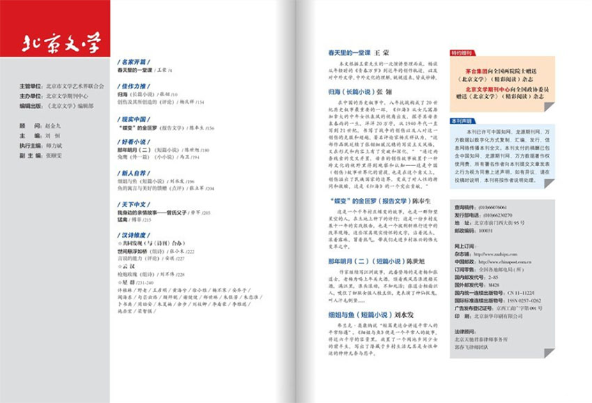 《北京文學(xué)》雜志作為一份具有深厚歷史底蘊(yùn)和廣泛影響力的文學(xué)期刊,自創(chuàng)刊以來(lái),始終堅(jiān)持為讀者辦刊,為讀者服務(wù)的宗旨,不斷推陳出新,以高質(zhì)量的文學(xué)作品和獨(dú)特的編輯理念贏得了廣大讀者的喜愛和認(rèn)可。這份雜志不僅是一本匯聚了各類文學(xué)精品的寶庫(kù),更是一個(gè)展現(xiàn)時(shí)代風(fēng)貌、反映社會(huì)現(xiàn)實(shí)的重要平臺(tái)。在雜志的每一頁(yè)中,讀者都能感受到濃厚的文學(xué)氛圍和深刻的人文關(guān)懷。雜志所選取的作品,無(wú)論是小說(shuō)、散文、詩(shī)歌還是報(bào)告文學(xué),都充滿了時(shí)代感和現(xiàn)實(shí)感,它們用文字記錄下了社會(huì)的變遷和人民的心聲,成為了反映時(shí)代精神的重要載體。