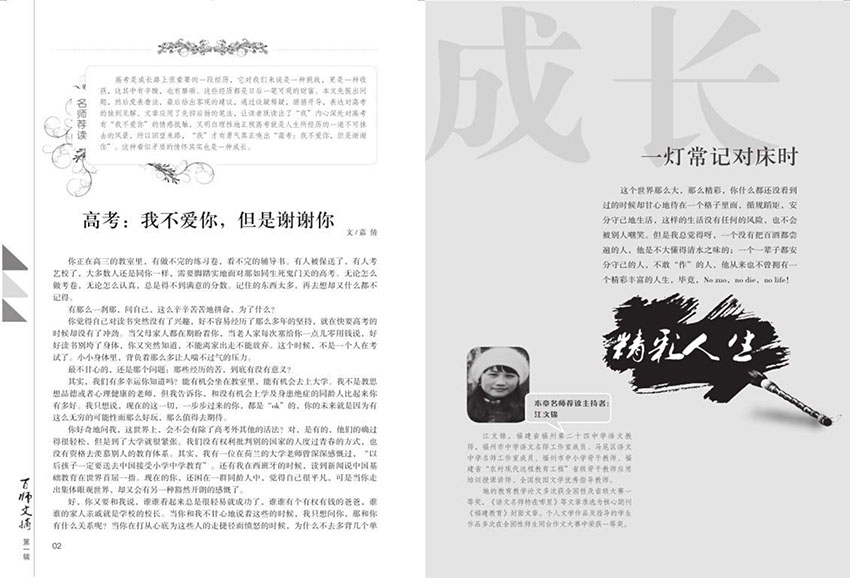 在這本雜志中,讀者可以讀到許多描寫深情友誼的故事,這些故事讓人感受到同學(xué)之間的互助和支持,讓人明白友情的可貴和珍惜。同時(shí),雜志也記錄了許多師生之間的感人故事,展現(xiàn)了師生之間的信任和理解。這些故事提醒著讀者,在學(xué)校里,師生之間的情感是非常重要的,它不僅是教學(xué)上的交流,更是生活中的指引。