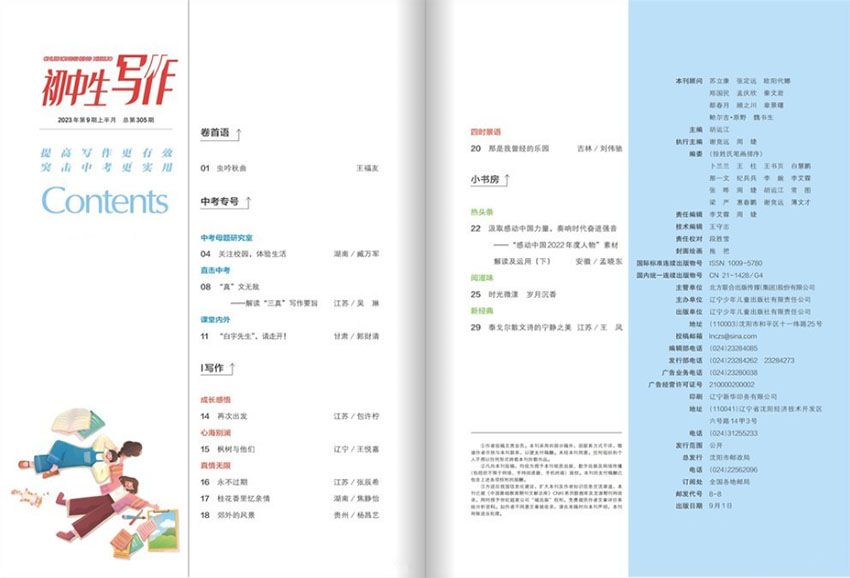 《初中生寫作》雜志是一本集知識(shí)性、實(shí)用性、互動(dòng)性于一體的優(yōu)秀刊物,以豐富的內(nèi)涵、新穎的形式、深入淺出的講解,為初中生提供了一本難得的寫作指南。無(wú)論是想要提高寫作技巧的學(xué)生,還是對(duì)文學(xué)充滿熱情的讀者,都能在這本雜志中找到自己想要的答案。