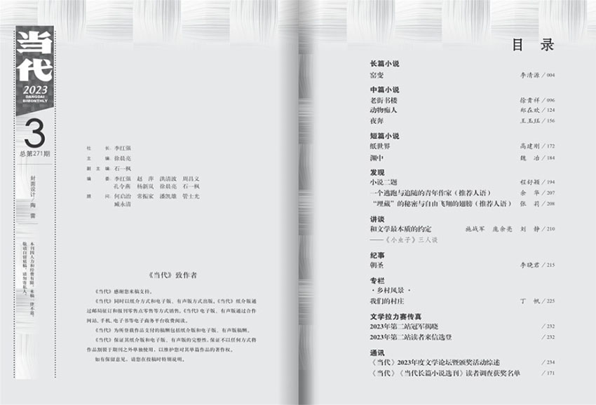《當(dāng)代》雜志是中國(guó)大陸一份具有深厚文學(xué)底蘊(yùn)和現(xiàn)實(shí)關(guān)懷的刊物,始終堅(jiān)守文學(xué)與現(xiàn)實(shí)相結(jié)合的創(chuàng)作理念,致力于推動(dòng)中國(guó)文學(xué)的發(fā)展,反映時(shí)代精神,記錄社會(huì)變遷,關(guān)注百姓生活,探索人生哲理。該雜志以關(guān)注現(xiàn)實(shí)、關(guān)注百姓、關(guān)注人生為立場(chǎng),注重作品的現(xiàn)實(shí)感和社會(huì)責(zé)任感。每期雜志都匯集了眾多優(yōu)秀作家的力作,內(nèi)容涵蓋小說(shuō)、散文、詩(shī)歌、報(bào)告文學(xué)等多種文學(xué)形式,這些作品不僅具有文學(xué)價(jià)值,更通過(guò)細(xì)膩的筆觸和深入的思考,展現(xiàn)了當(dāng)代中國(guó)社會(huì)的真實(shí)面貌和人民群眾的精神風(fēng)貌。