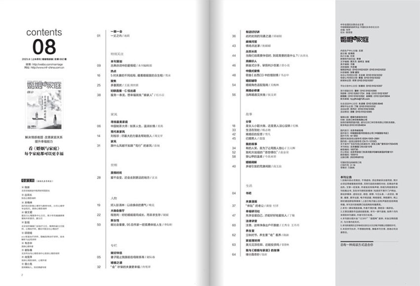 雜志致力于傳播積極的價值觀,提倡健康、和諧的婚姻與家庭關(guān)系,倡導(dǎo)尊重、理解、信任和包容的家庭氛圍,通過報道成功的家庭案例、專欄文章和讀者來信,雜志為讀者展示了實(shí)現(xiàn)美滿家庭生活的方法和路徑。雜志打破了傳統(tǒng)婚姻與家庭觀念的狹隘界限,以現(xiàn)代、開放、多元的視角探討問題,無論是同性婚姻、單身家庭、跨文化婚姻,還是其他與婚姻和家庭有關(guān)的話題,雜志都給予了充分的關(guān)注和討論,旨在幫助讀者更好地理解和應(yīng)對不同的家庭形態(tài)。