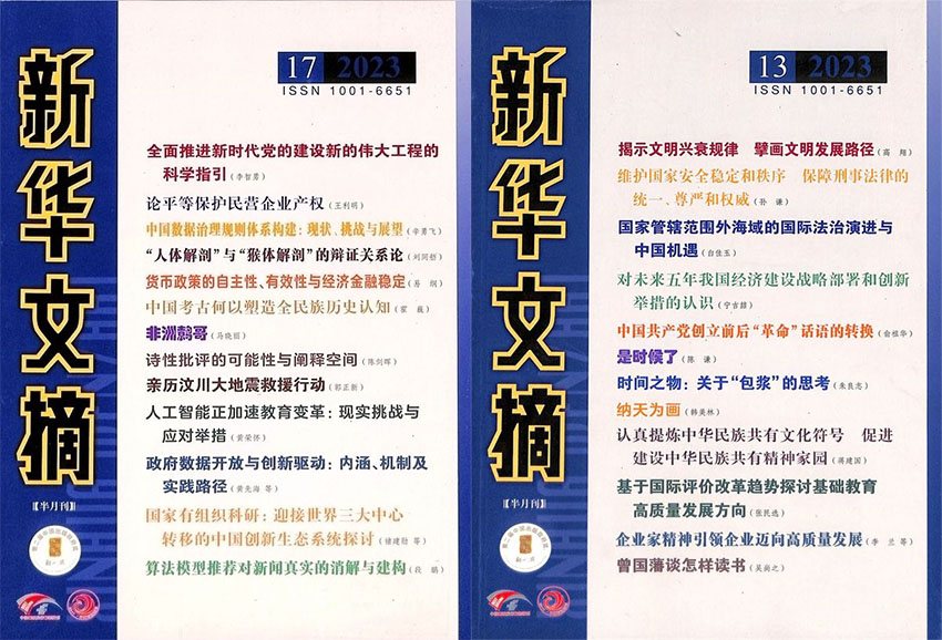 《新華文摘》雜志已經(jīng)成為中國期刊界的一顆璀璨明珠,深受讀者喜愛和學(xué)術(shù)界認(rèn)可。以思想性、權(quán)威性、學(xué)術(shù)性、資料性、可讀性和檢索性為特點(diǎn),致力于為讀者提供高質(zhì)量、高水平的學(xué)術(shù)成果和思想觀點(diǎn)。它涵蓋了政治、經(jīng)濟(jì)、文化、社會(huì)、歷史、哲學(xué)等多個(gè)領(lǐng)域,以深入淺出的方式闡述各學(xué)科的前沿動(dòng)態(tài)和熱點(diǎn)問題。該雜志選登的文章均來自各領(lǐng)域的知名學(xué)者和專家,代表了相關(guān)領(lǐng)域的前沿思想和最新研究成果。這些文章不僅具有很高的學(xué)術(shù)價(jià)值,也具有很強(qiáng)的現(xiàn)實(shí)意義和社會(huì)影響力。