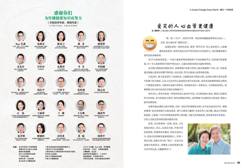 《自我保健》雜志將始終堅(jiān)持提供高質(zhì)量的內(nèi)容,成為讀者健康生活的可靠伴侶,相信通過(guò)努力向讀者傳遞實(shí)用、科學(xué)、可靠的健康信息,能夠幫助更多人改善生活方式,提高生命質(zhì)量。無(wú)論是年輕人還是老年人,無(wú)論是白領(lǐng)還是家庭主婦,每個(gè)人都應(yīng)該關(guān)注自己的健康,照顧好自己和家人的身心健康。